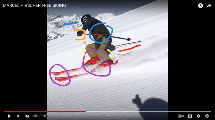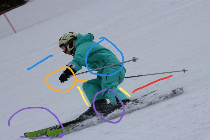 Голени у тебя имеют разный наклон (желтым), внутреняя заметно меньше наклонена, и выехала вперед, у Х - намного ближе к параллельности, и внутренняя выехала вперед ровно чтоб обеспечить заметно большие углы закантовки.