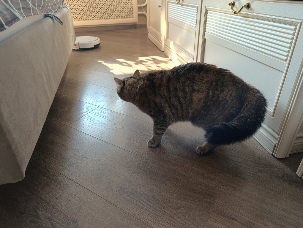Нормальные коты катаются на пылесосах , а не охотятся. Я жду, когда у соседа по даче ДжекРассел научиться кататься на роботе - газонокосилке. Пока он без ума от САПов, убегает от хозяина и прыгает с причала на мой САП.