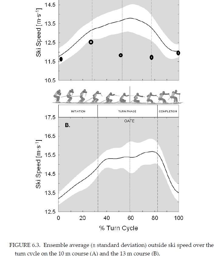 Ускорение между поворотами в безопорном транзите у центра масс лыжника есть только одно -ускорение свободного падения. Можно ускорять лыжи до бесконечности, ЦМ при этом дополнительно не ускорится
