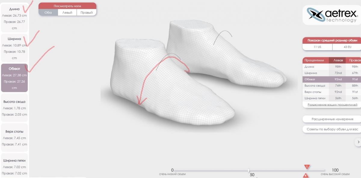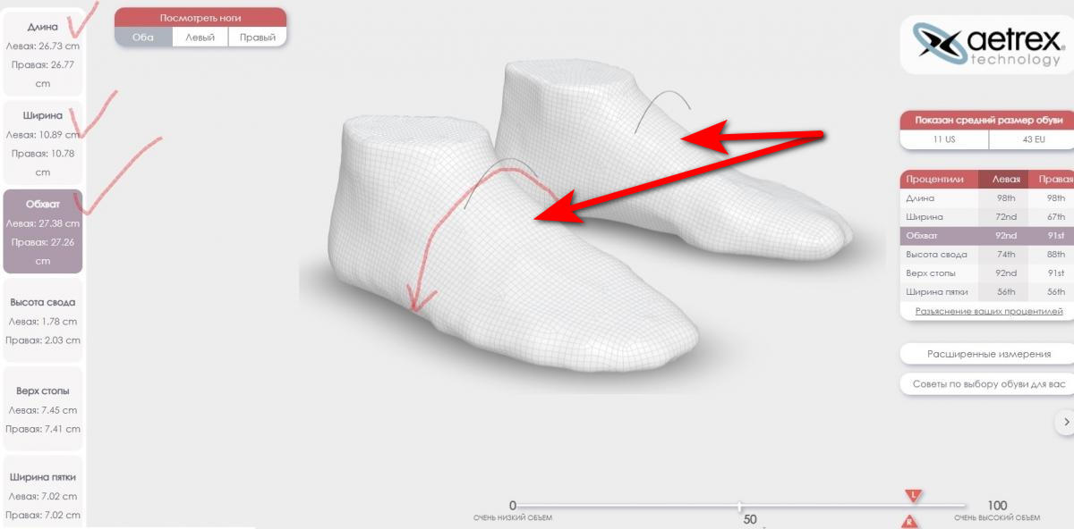На картинке ниже результат измерения стоп в 3D по технологии Aetrex.