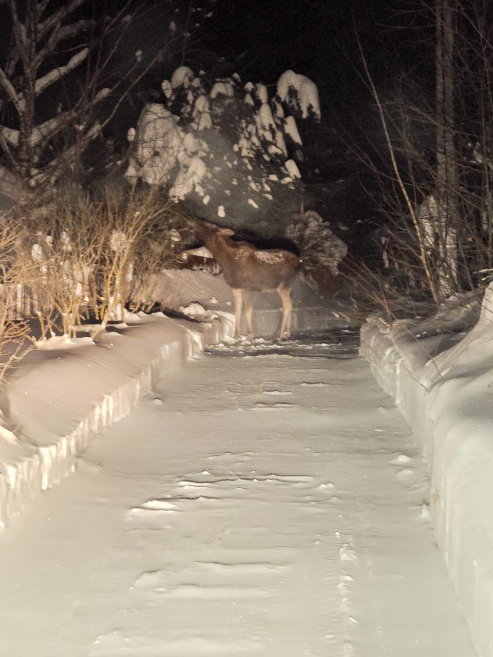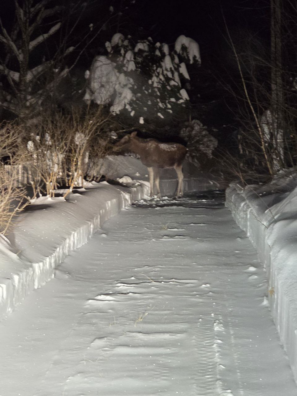 Выезжаем с дачи, ближнее Подмосковье по Дмитровке, а тут ОН. Стоит. Ёлку жуёт. А выезд только прямо, позади тупик.