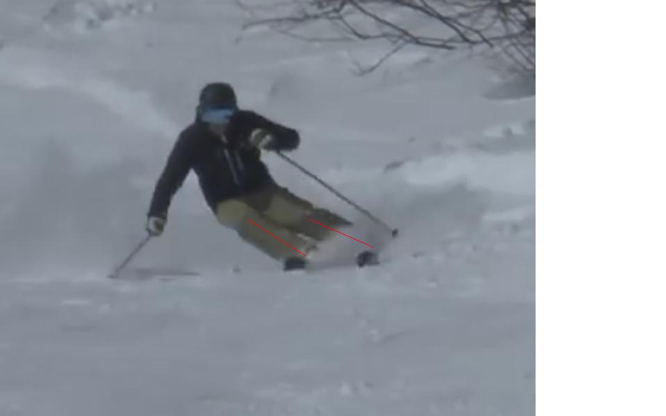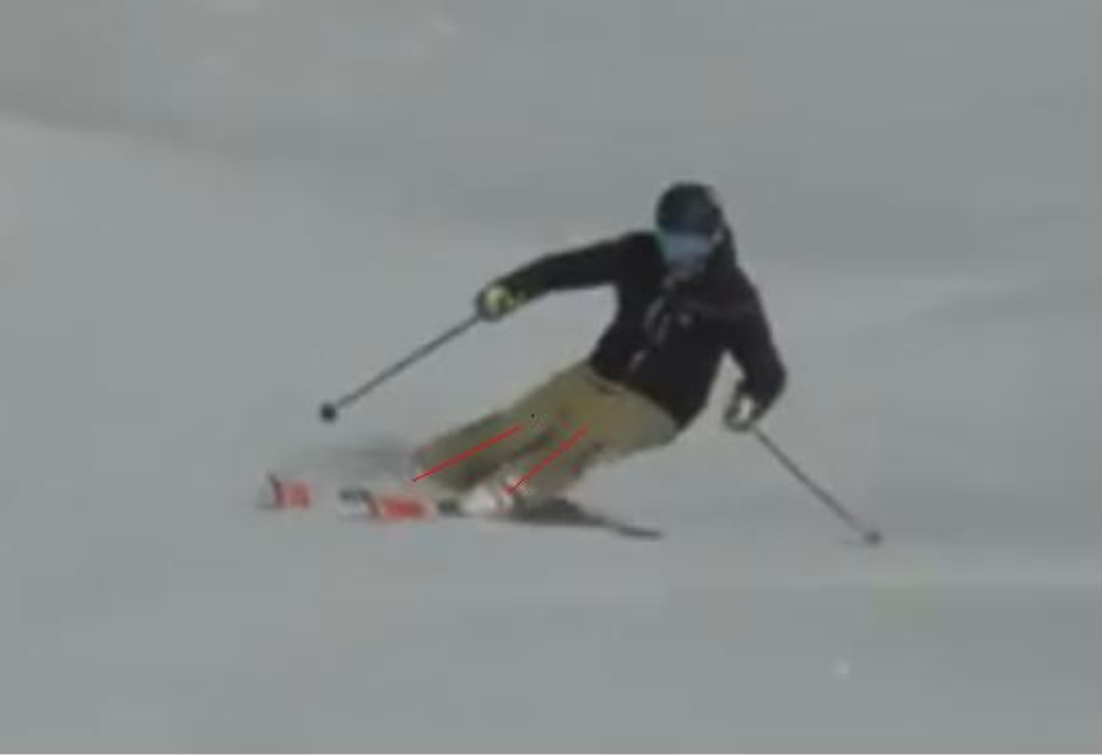 "Ощущение того, что при прохождении поворотов на жестких трассах нагрузка распределяется равномерно на обе лыжи, иногда вводит в заблуждение. При выраженном крене внутренняя нога сильно согнута. Даже если согласно "ощущению силы" лыжник опирается на внутреннюю лыжу так же сильно, или даже сильнее, чем на внешнюю, давление на внешнюю лыжу тем не менее значительно выше. При равном напряжении, на относительно прямую внешнюю ногу оказывается давление, во много раз превышающее давление, которое может быть приложено к согнутой внутренней ноге. "