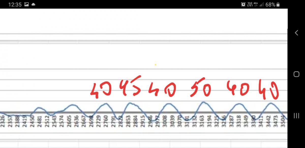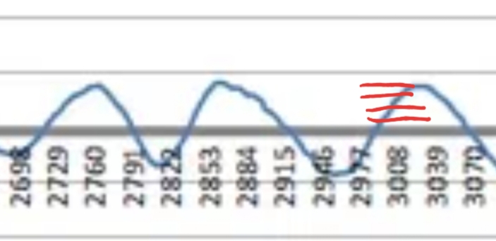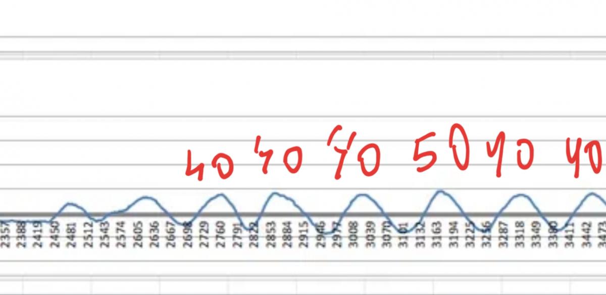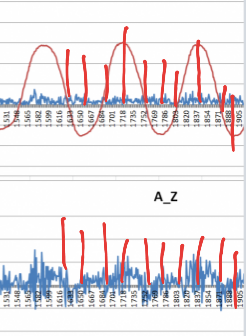 Где то на пик верхнего приходится пик нижнего, где то нет. На всякий нарисовал метки и на пересечение нуля верхним - но он похоже сдвинут и они не являются моментом перекантовки. Но в общем разброс даже на этих 3 циклах большой даже если смотреть только по максимумам.