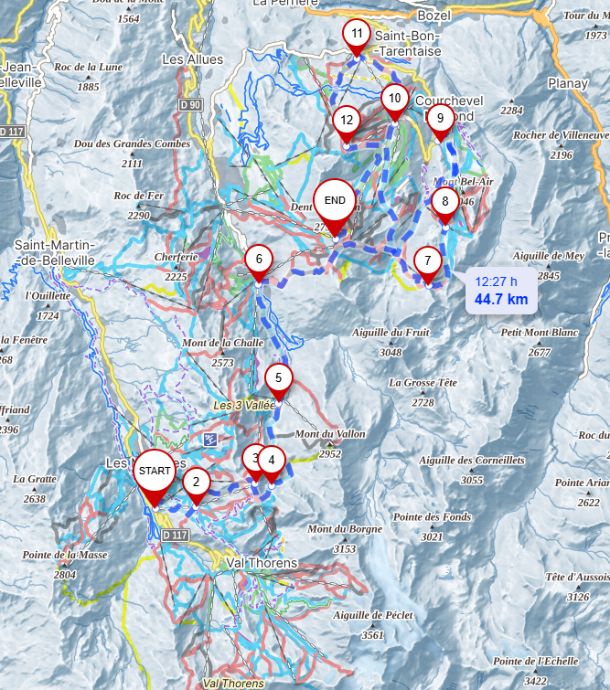 понял. У меня из брюера, к монт валлону, оттуда в менуир и в куршавель. Два раза по двум черным трассам с сигнала или солюра, не помню аак называется, потом под подъемником мармот сначала под ним, а потом синей петлнй, потом на шандаросе в дальний куршавель, мотом в аэропорт на обед. Потом вниз куршавеля и там пару раз на чуизе в сторону богателя, оттуда в сторону латаньи, и в сторону мерибеля, там пару раз черную трассу и в фолидус.из Сен Мартена двумя креслами с пересадкой на перевал, зигзуги по Меньюиру, спуск в Валь Торанс, подъем на Фунителе и спуск оттуда.
