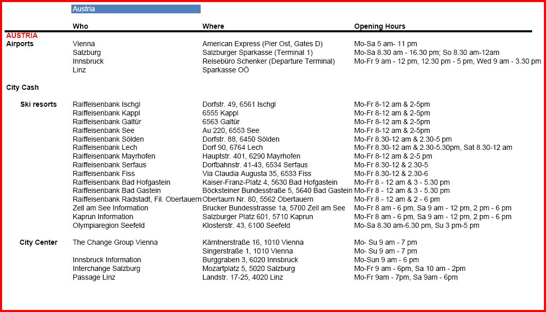 Адреса пунктов обкэшивания для Австрии: