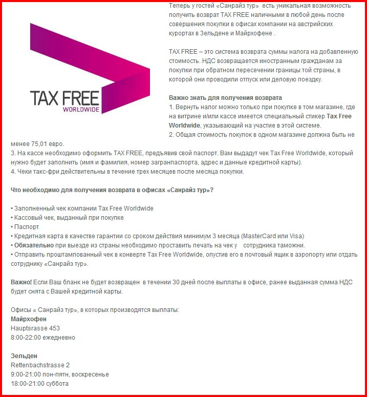 Австрийский такс-фри проще всего получать наличными на месте в Зельдене (одновременно вручается брошюрка по такс-фри вместе с конвертом для таможни), а потом на границе отштамповать чеки, заклеить в полученный конверт и бросить их в почтовый ящик (на конверте для таможни уже есть необходимый адрес и марка). По Австрия-такс-фри наличные за пределами Австрии не получишь, в отличие от системы Глобал-такс-фри (по чекам которой в их пункте в аэропорте Мюнхена наши обычно и обкэшиваются).
