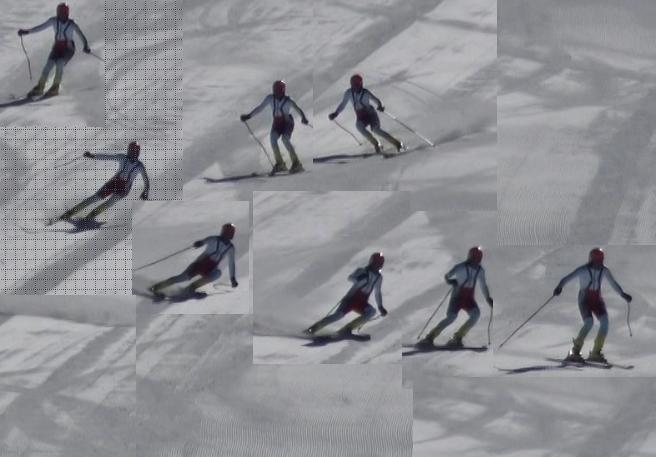 Прямые ноги на сопряжении - можно, но рискованно. Может перекинуть через виртуальный бугор. Вот собственно раскадровка - попросил человека исполнить по ГГ на гигантских лыжах. Только без гуся и сгибания внешней. Как Ванька-Встанька. Условия - склон 35-40 процентов, лед, примерно как на леднике ранним утром, от ратрака бархат ледяной. Лыжи 24 или 26 метров радиуса не меньше 186 длины. Поворот на самом деле компактнее в масштабе, иначе пришлось бы мне вырезать контуры, и т.д. в верхнем левом углу - вход в поворот.