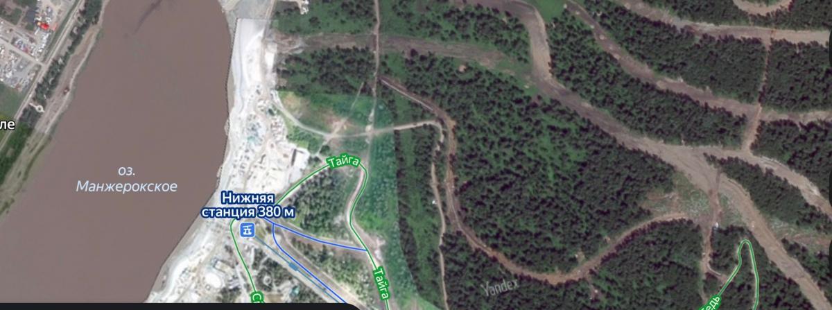 Судя по спутниковым фото - похоже, будет вот так, как на картинке (в деревне видно что-то красное, похожее на нижнюю станцию, на верхней части новых, уже хорошо видных трасс- площадка под верхнюю станцию и от нее вниз - прямая просека на полгоры как раз в район нижней красной станции). Но наверняка в нижней части горы будет подсадка, куда можно будет добраться по зелёной трассе Тайга.Мне вот интересно, в каком месте будет начинаться канатка через озеро?