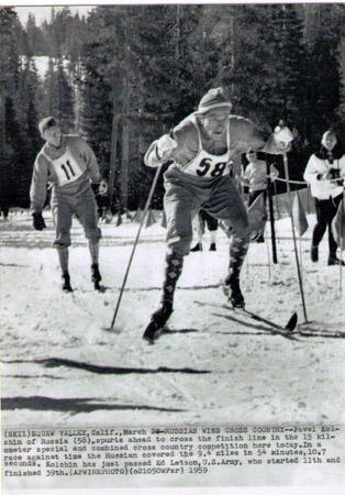 "Русские выигрывают в гонке. Павел Колчин (58), в финишном спурте пересек финишную линию в 15 километровой гонке в специальных и комбинированных лыжах сегодня. В гонке на время русский прошел 9,4 мили за 54 минуты 10,7 секунды. Колчин обошел только Эда Летсона, Армия США, который стартовал 11-м и финишировал 39-м.