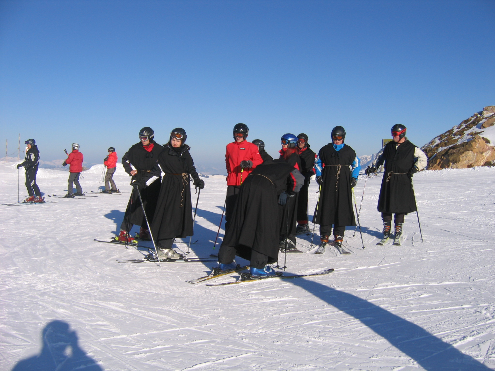 Подъехал ближе и глазам не поверил - монашки местные в количестве порядка 30-40. Все в черных рясах, как положено по уставу, и все на лыжахИз цветного - только лыжи да ботинки (которых почти не видно).