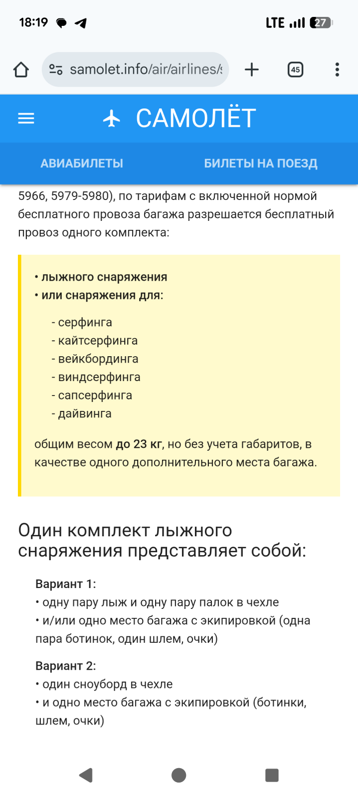 Залез на сайт Аэрофлота, посмотреть про бесплатный провоз лыж