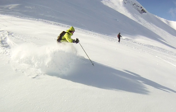 Как то раз катались на Лауре после снегопада, так как все остальное было естественно по лавинке закрыто. На трассах было наверное 20-25 см свежего снега и не ратрачено. Это было очень кайфово