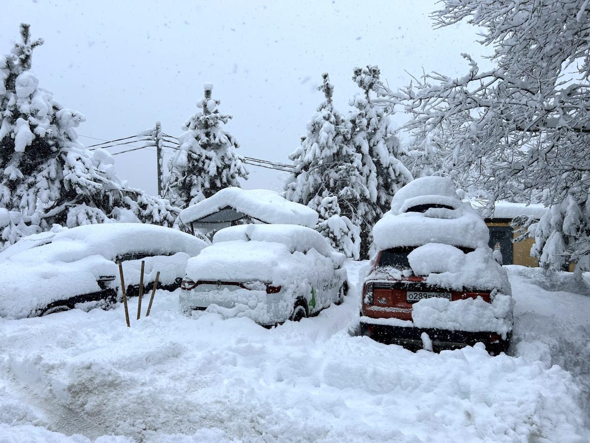 В Поляне ежегодный декабрьский снежный апокалипсис. Припоздал в этом году на пару недель. До магазина не дойти. Люди заказывают продукты онлайн, продавцы в мыле собирают заказы, а доставщики из-за снега не ездят. Мы дошли сами по колено в снегу. Фото на стоянке у магазина.