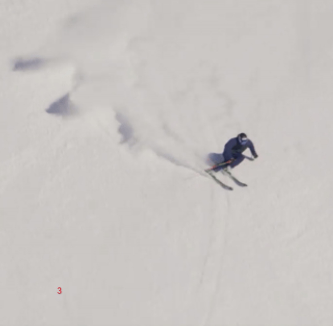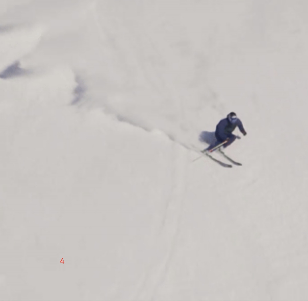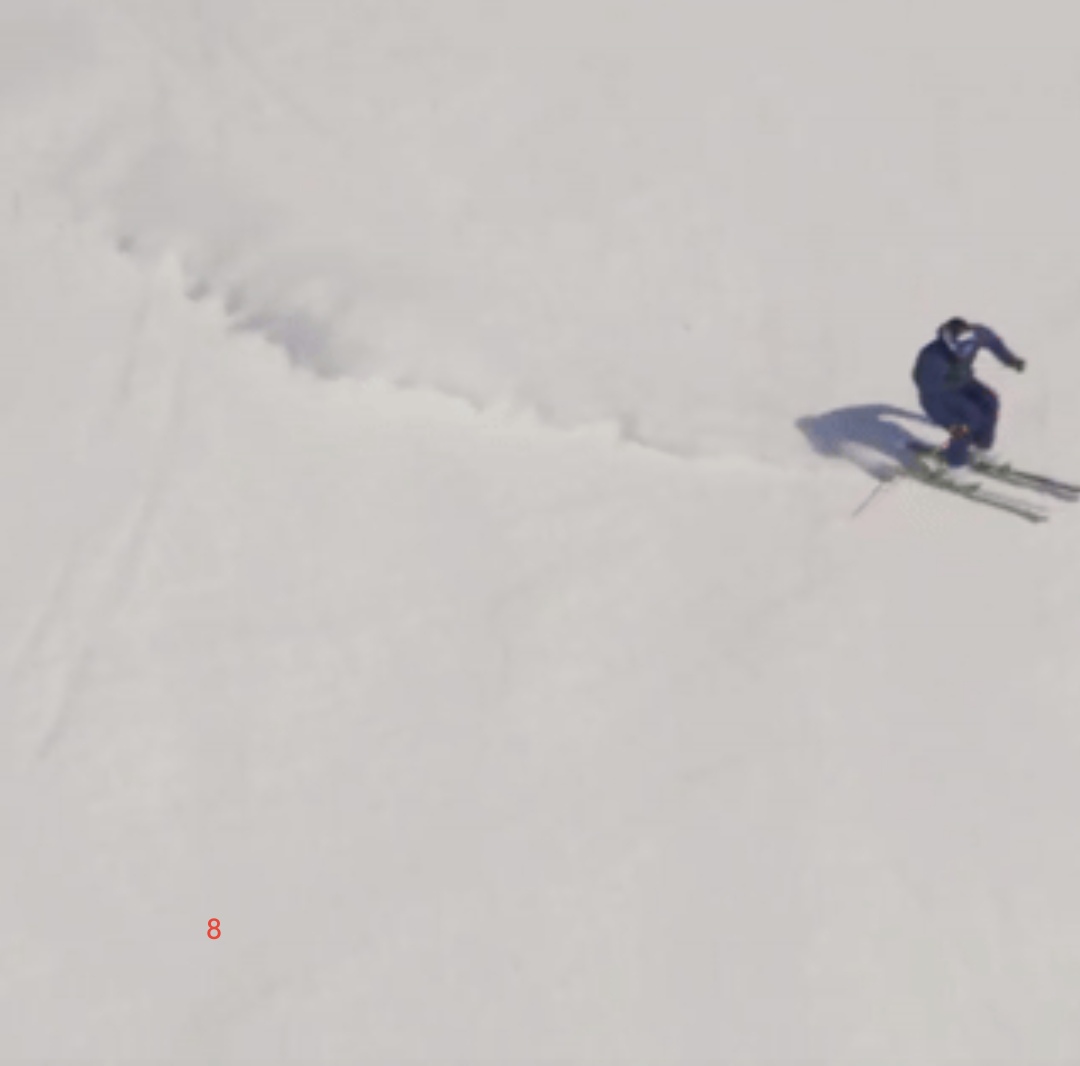 а вот левая не просто разгружена, а удерживается, иначе стрельнула бы уже во внешнюю если бы внутренний кант с носка цепанулт снег.