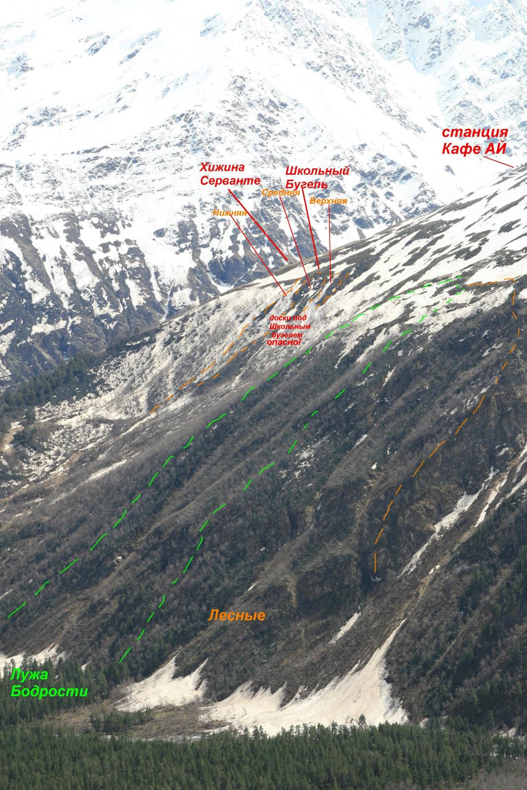 Лет 5 назад помогал чуваку спустится вниз, он попал в лавину в березках по моему в первом проезде от основного, его протащило по березкам, там с рукой что то было и с ребрами, одну лыжу похоронило. Эти лавинки быстро задувает их не особо видно. Сошла после переноса. На утро переносы задубели..