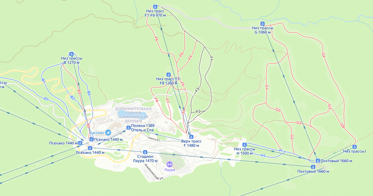 А если не совсем сезон и переездов физически нет, то между Пихтовым и Псехако есть горизонтальная гондольная канатка, проходящая над биатлонный стадионом.И Пихтовый и Псехако это Лаура. Между ними есть переезд на лыжах и туда и обратно.Переезды между секторами F и G. С G на F даже два переезда.Один начинается от нижней станции подъемника, второй с середины трассы G Номер не помню, самая левая если смотреть сверху.Переезд с F на G почти в самом начале трассы F1.