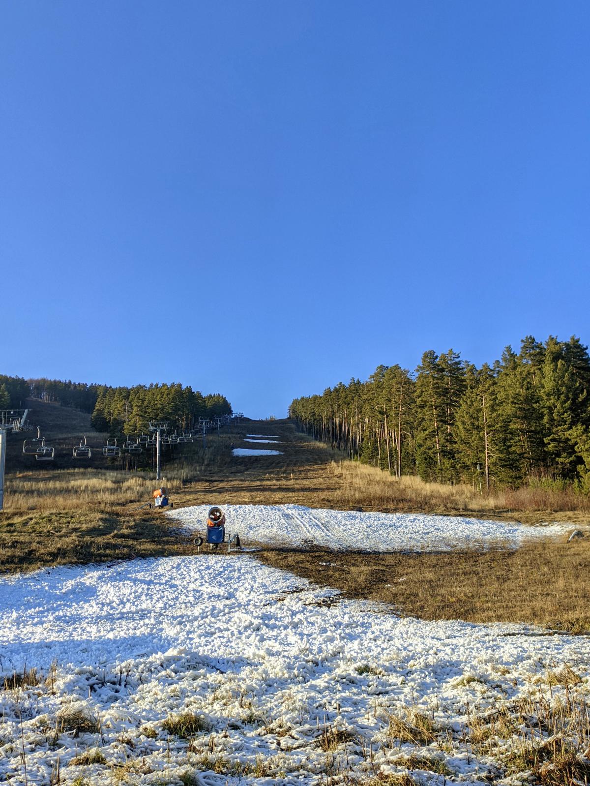 Если морозы стоят хоть немного от 0, то трассы надуют и снег не нужен для катания. Вот только до трассы от парковки стрёмно в ботинках по земле, да щебёнке топать. И самое стрёмное, что ратраки паркуются на щебёночной площадке. и когда на склон выезжают, то этот гравий туда тащат и по всей горе разносят. Ну это в бесснежные зимы. У меня для таких условий специальные лыжи есть.)))
