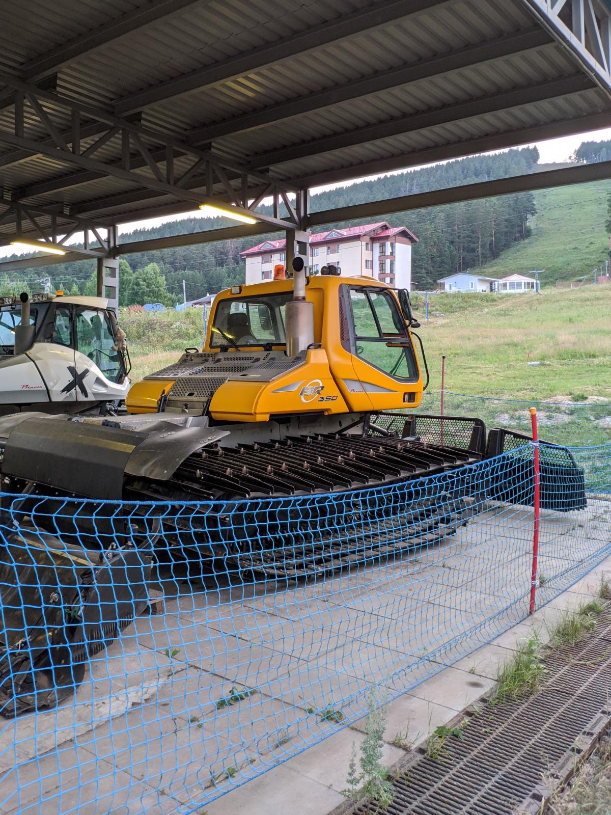 И самое стрёмное, что ратраки паркуются на щебёночной площадке. и когда на склон выезжают, то этот гравий туда тащат и по всей горе разносят. Ну это в бесснежные зимы. У меня для таких условий специальные лыжи есть.)))