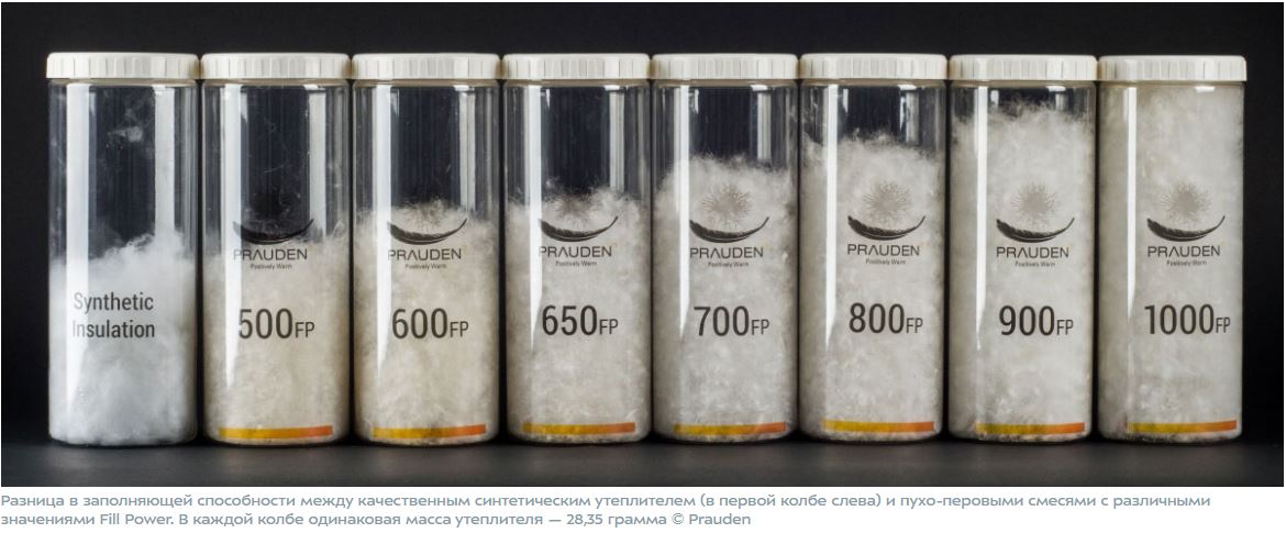 Есть показатель пуха Fill Power. Обозначает соотношение вес/тепло, более понятно - заполняющая способность. Объём разного пуха одного и того же веса. На куртках обычно указан в виде числа, например, 600, 750, 900