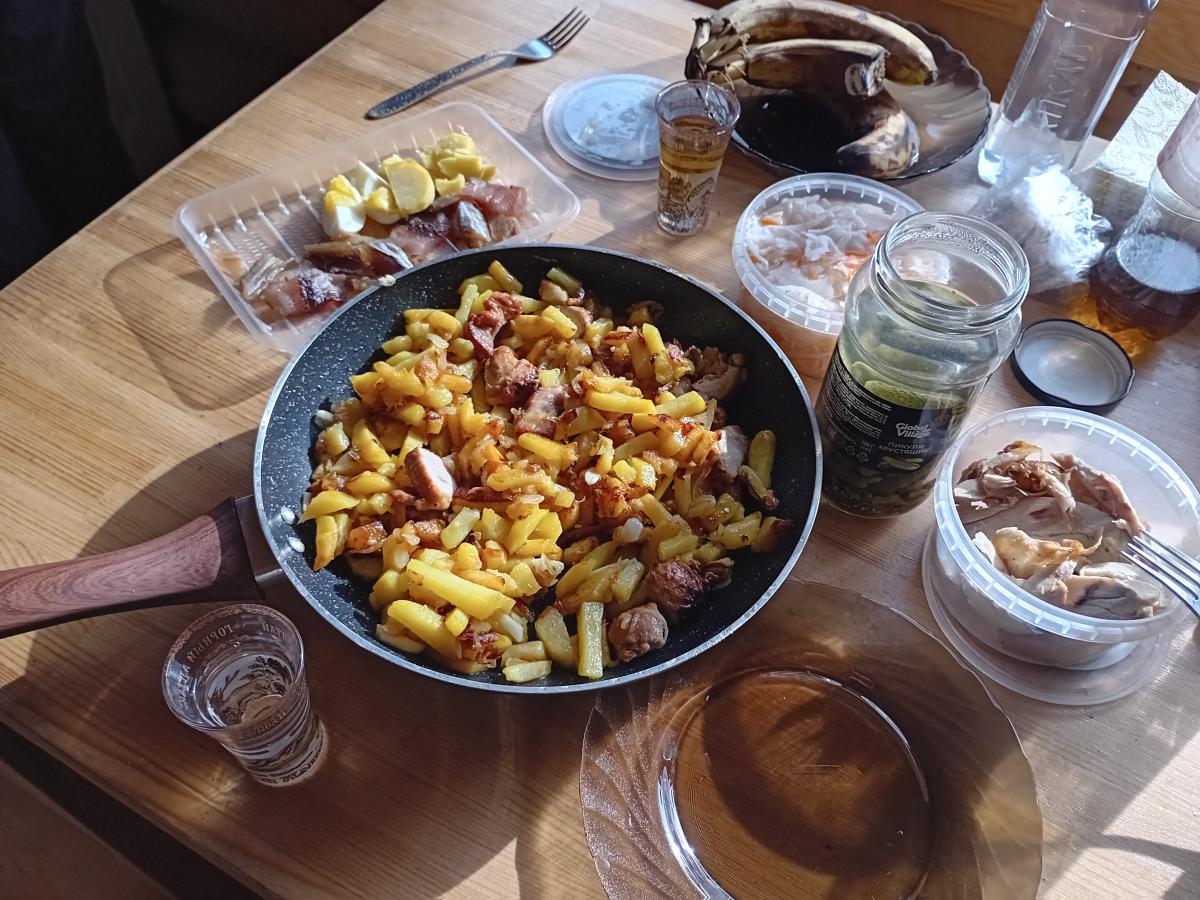 После каталки хочется есть ) А идти в магазин, потом готовить… ну можно конечно, если с горки в обед уходить. Или как Волк - замесить на неделю корыто хрючева. Но у нас в обед уходить не получается, обычно уже в сумерках, а там по рюмашке и на ужин. Хорошо если в отеле ужином кормят, нет - приходится в рест, увы, по другому не получается)
