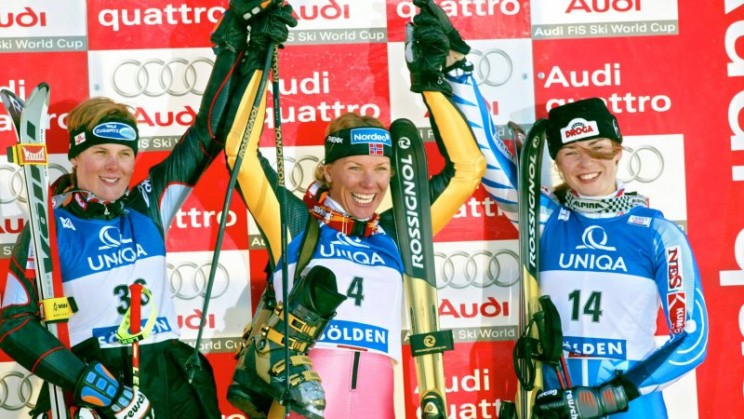 26 октября 2002 года. Три спортсменки стоят на подиуме после гигантского слалома в Зёльдене, но все - на верхней ступеньке. Ничего подобного раньше не было.
