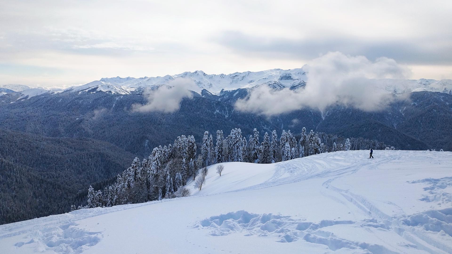 Вот это фото я сделал утром на Розе Хутор, в начале трассы "Календула". На том самом бугре, куда люди идут пешком.